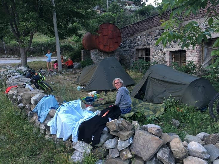 On s’arrête le soir dans le seul village de la vallée, Moglice. Un bar, une épicerie. On arrive à dialoguer en anglais avec la fille de l’épicière. Pas de plan évident pour dormir… La bande de gamins du village comprend le problème et nous trouve un endroit où poser nos tentes. On est un peu l’attraction du village. A part des cyclistes égarés il ne doit pas y avoir grand monde à s’arrêter !