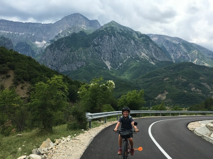 Plus loin nous descendons vers la rivière, les enfants en profitent pour une petite baignade matinale. La route continue encore quelques kilomètres, puis se continue en piste. Des Allemands nous rejoignent en vélo électrique avant que nous nous y engagions. Ils viennent nous parler et nous expliquent qu’ils ont essayé de la prendre en sens inverse, mais qu’ils ont du faire demi tour malgre leur camping car 4×4. Ils nous expliquent que la piste est de mauvaise qualité avec des ornières et de la caillasse. Nous hésitons mais pour rejoindre Permet, notre prochaine étape, c' est soit cette piste de 25 kilomètres, soit on fait demi tour vers Berat notre point de départ, et ensuite un grand détour par une grosse route. On préfère tenter, quitte à pousser ou marcher un peu.