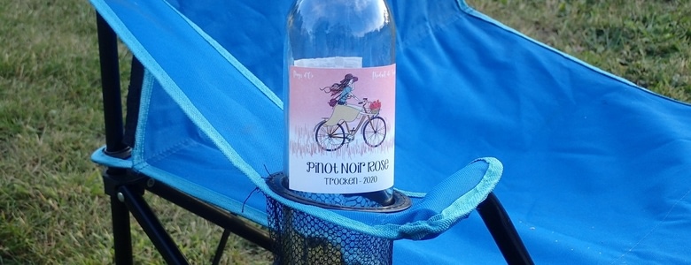 Alveninte al la kampadejo, post duŝado kaj butikumado, estas tempo festi someron. Eta botelo de roza vino. Je via sano !