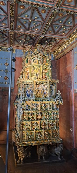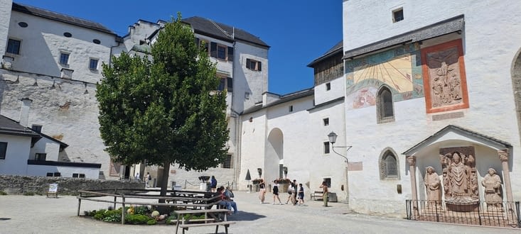 Le tems passe et nous voulons absolument visiter la forteresse de HOHENSALZBOURG. Nous prenons la visite complète. Les appartements princiers, une chambre est en cours de rénovations, possèdent de belles boiseries avec beaucoup de dorrures, des poeles en faïence très colorés, des colonnes en marbre. On visite également le musée avec des armes anciennes, des tenues d'époques ainsi que des instruments de tortures. Le plus intéressant c'est la vue magnifique sur la ville depuis le haut de la forteresse.