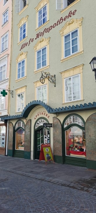 Nous visitons que la vieille ville de Salzburg. On commence par la rue principale célèbre pour ses magnifiques enseignes en fer forgé. On s'arrête devant la maison natale de Mozart. Évidemment nous revoyons l'ancienne pharmacie de la cour des princes qui a gardé ses boiseries rococco et ses vieux tiroirs. On peut voir...mais on ne peut pas photographier.