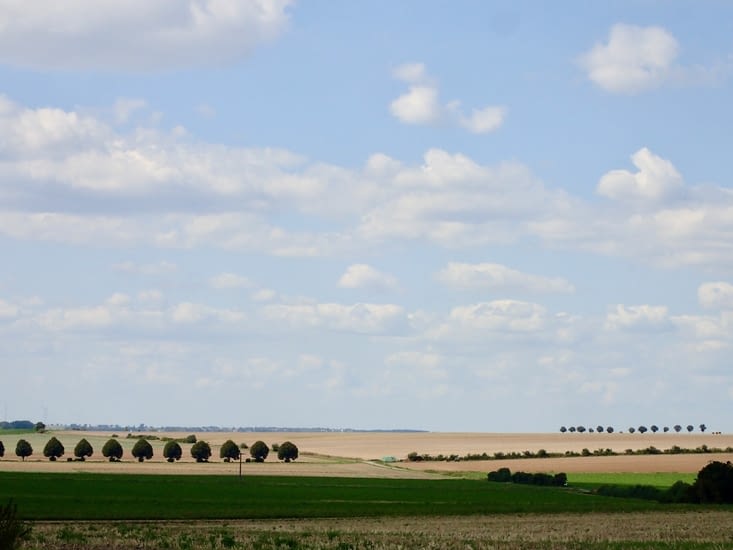 L’étape du jour est courte, de Baierstedt à Brunswick. Nous y passerons deux nuits chez Eckart et Christine, que nous avions à croisés à Ystad, en Suède, début juillet. Ils étaient eux-mêmes en vélovoyage. Ils nous ont gentiment inviter à séjourner chez eux. Nous retournerons un peu sur nos pas demain jusqu’à Schoppenstedt pour y visiter le musée Till Uylenspiegel. Nous l’avons vu ce midi et y avons même pique-niqué mais impossible de le visiter, il est fermé le lundi.Le vent est tombé, c’est une bonne chose. La chaleur est modérée, en tout cas parfaitement supportable. Les paysages sont d’une beauté absolue, tout, la grâce des courbes des collines, la variété des couleurs jamais agressives, l’élégance des éoliennes – que voulez-vous un Flamand aime les moulins. Le bruit que certains leur reprochent, je l’appelle leur chant, je les trouve graciles, comme les phares et assurément plus discrètes et moins dangereuses qu’une centrale nucléaire. Les arbres plantés au garde-à-vous au sommet des collines me rappellent la Toscane. Ils sont ici en boule plutôt qu’en pinceau mais découpent semblablement le paysage, rappelant que cette nature n’est pas si naturelle, elle est le résultat du travail respectueux de l’homme qui l’a façonnée.