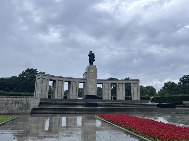 Réveil compliqué mais la sieste fait du bien, sac à dos parés, on est prêts à faire notre première journée à Berlin. On s’est prévu cette après midi quelques points à voir à commencer par le reichtag. On entame notre marche, je dois l’avouer, il pleut ! (Parfois des trombes mais peu importe, on ne peut pas se gâcher une journée) On traverse la forêt dans un très grand parc de berlin nommé Tiergarten. On s’arrête un instant devant le mémorial soviétique du parc avant de finir devant le reichtag. Le bâtiment est plutôt joli, on peut y visiter la coupole mais il fallait s’y prendre un mois à l’avance pour qu’avoir les billets, on se contentera donc de la façade extérieur. Mes excuses d’avance, les photos sont limitées, mon téléphone n’étant pas waterproof.Notre troisième stop, non loin de là, est la fameuse Brandenburg gate, d’abord symbole de division car représentant l’entrée de l’ancien Berlin et située dans le « no man’s land », elle est maintenant représentante de paix et d’unité. Malgré une météo peu clémente, ce lieu chargé d’histoire est toujours impressionnant à voir . Prochain stop, gendarmenmarket pour aller admirer une cathédrale française et une église allemande, jumelles et magnifiques. Elles ne sont pas des cathédrales au sens religieux du terme c.-à-d abritant un évêque mais plutôt de leur nom allemand « Dom » , signifiant « grand édifice religieux à coupole »La véritable cathédrale de Berlin, nous l’avons également vu durant notre ballade et elle est aussi magnifique, avec de grandes coupoles, qui semblent etres communes à beaucoup de monument berlinois.Le dernier stop au programme, c’est le célèbre Checkpoint Charlie, (Charlie en référence à l’alphabet militaire de l’OTAN : Alpha, Bravo, Charlie) le plus célèbre des postes-frontières durant la séparation de Berlin est et Ouest. Celui ci était réservé aux diplomates, militaires et étrangers, les berlinois y étaient interdis.C’est toujours impressionnant de réaliser que ces symboles de libertés sont des vestiges d’une histoire qui n’est finalement pas si lointaine! Trempés et fatigués (et oui on avait déjà parcouru 11km finalement dans ce petit laps de temps), nous avons décidé de prendre place dans notre petit studio. Non sans passer par un des meilleurs spots pour déguster un currywurst, une saucisse grillée couverte d’une sauce ressemblante à un ketchup épicé et de curry en poudre, c’est très bon.