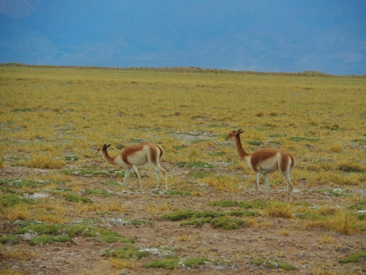 Nous roulons désormais dans l’altiplano, cette région au proche des 4000m d’altitude qui se divise entre la Bolivie, l’Argentine, et le Chili. Nous croisons des vigognes, ces camélidés au style raffiné que nous avons déjà croisé lors de précédentes excursions.