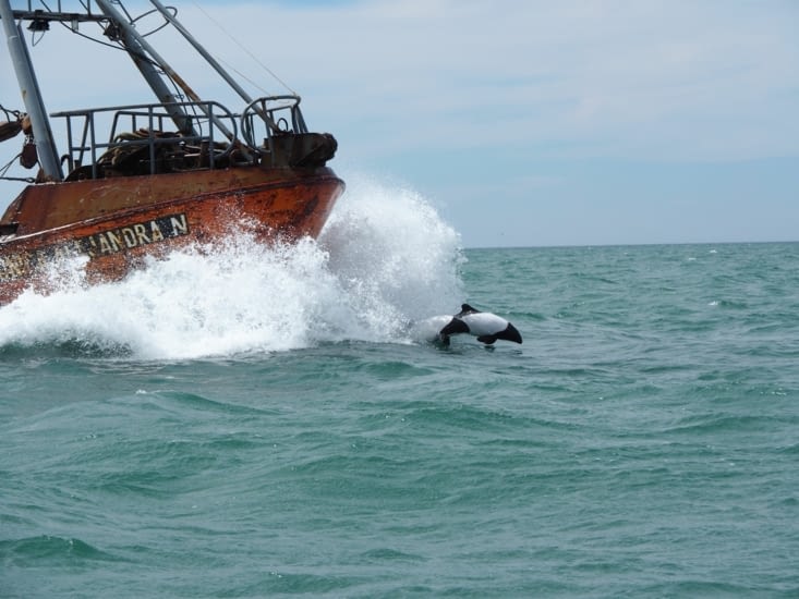 Les dauphins de Commerson sont très petits, très vifs. Ils ont la particularité d'être noirs et blancs, il est facile de les repérer quand ils arrivent autour de l'embarcation. En revanche, il est très difficile de les photographier, ils sont trop rapides !