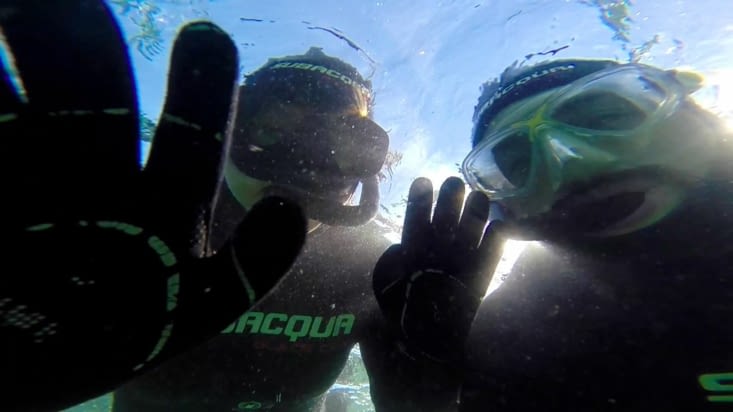 Nous avons le droit, avant de partir en mer, à un petit cours théorique (vidéo et démonstration) sur la nage avec les lions de mer. Fins prêts, nous pouvons prendre le large...