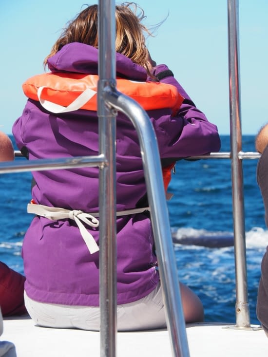 Dans notre sortie, nous croisons un chalutier qui rentre au port. Sa puissance est aussi source de curiosité pour nos amis dauphins. Nous nous mettons à la hauteur des marins pécheurs (qui nous saluent à coups de klaxon), afin d'observer les dauphins qui s'amusent à sauter à l'avant du navire.
