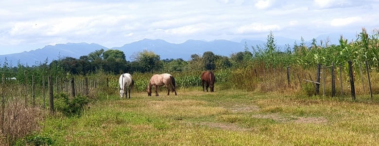Nous quittons le lieu des frayeurs, Barbara avec Loco et Limón, Alex à pied avec Pandora, et reprenons la route, dans l'espoir de trouver une pâture dans laquelle notre jument pourra se reposer jusqu'à son rétablissement. Son postérieur gauche est enflé et semble être douloureux, mais elle marche sans boiterie. Nous espérons tout de même ne pas avoir à faire trop de route avant de tomber sur une ferme... Après une traversée du fleuve Rosario chaotique-qui nous aura valu une traversée humide et le mouillage de nos passeports soigneusement rangés dans les bananes que nous portons à la taille (comme quoi, rien ne sert de chercher le style en voyage !)- nous croisons un gaucho qui nous oriente vers la "casa rosada". La chance nous sourit, puisque nous tombons, à quelques centaines de mètres, sur l'aimable propriétaire de la dite demeure, Amalia, de son prénom. Elle appelle son fils, Pantxo, dans la minute, et ce dernier accepte d'héberger nos chevaux dans l'un des enclos dans lesquels il élève ses propres pasos péruviens.