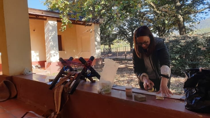 Malgré l'inquiétude de retrouver les chevaux empoisonnés le lendemain, nous nous régalons avec le pain casero que nous offre Elena, la grand-mère octagénaire qui tient cette vieille maison. Elle vit seule ici avec sa fille, au milieu des vaches et des chèvres, alors les visites régulières de l'infirmier, basé à une quinzaine de kilomètres de là, sont d'immanquables occasions de papoter. Nous nous couchons avec le son mélodieux de la radio - seul moyen de communication dans cette zone sans réseau - qui fonctionne en continu, au gré des bavardages du voisinage. Aux alentours de minuit, le silence se fait... mais Barbara se réveille tout de même trois fois dans la nuit pour s'assurer que la petite troupe aille bien et qu'elle mange à sa faim, en particulier Pandora qui, à force de pivoter autour de son piquet, réduit considérablement sa longueur de corde et donc sa quantité de nourriture. A priori aucune blessure n'est à déplorer !