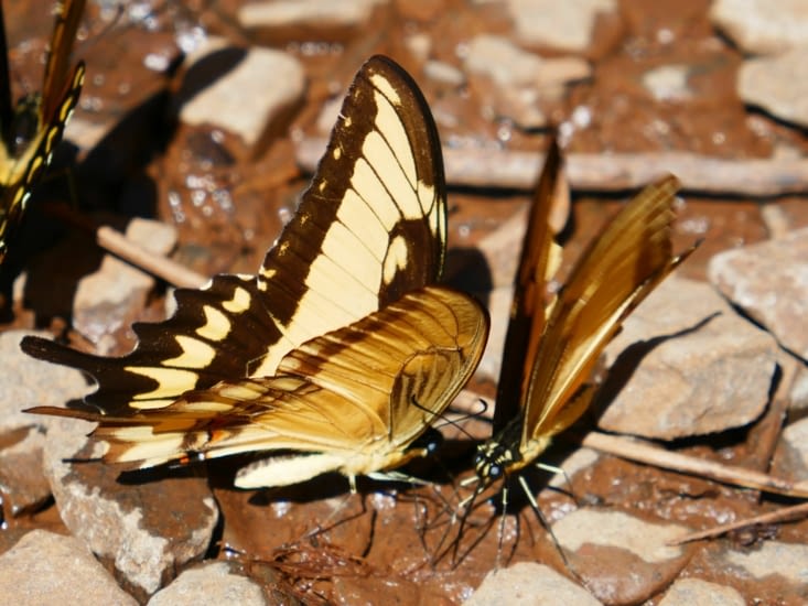 Comme Mr météo prévoit un temps superbe, nous commençons par le côté argentin. Il est beaucoup plus aménagé avec plusieurs kilomètres de passerelles : pour voir les chûtes d'en bas, d'en haut, sur le côté, de l'autre côté (ah, non, là il faut aller au Brésil). Les chûtes font 2,7 kms de long sur 80 m de haut. Elles sont au cœur de la forêt tropicale avec une végétation exubérante. Les cascades, en étage parfois, se jettent les unes dans les autres et percent au milieu de la verdure. Elles grondent et le tout est absolument impressionnant. Nous nous sommes sentis bien petits dans cet amphithéâtre naturel.