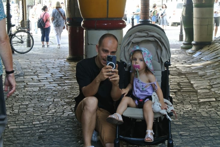 16h, rdv sur le bateau pour visiter le Danube. Nous voilà partis pour 75 minutes. Comme d’habitude, c’est nouveau, Nina a peur, « pas bateau » et s’agrippe à maman. Puis au bout de 10/15 min, on passe à lavant du bateau, on observe l’eau, et la Nina s’éclate les cheveux au vent ! Enfin un semblant de fraîcheur dans cette canicule ! Maden dit trop rien il est sage (et oui, quand Monsieur a bien dormi, Monsieur est content).