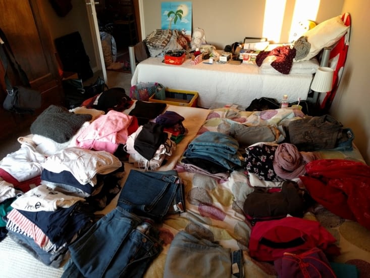 Nous avons choisi de ne pas suivre les conseils des sites de backpackers selon lesquels tu pourrais presque partir à poil, "car tu achèteras tout sur place". Nous avons plutôt chacun opté pour un sac de voyage de 95L que nous avons chargé à +- 20 kgs. L'idée est d'avoir tout ce dont on a besoin, dans un sac qui pourra se ratatiner complètement dans le van. Cela signifie pas de roulettes, donc nous les porterons en sac à dos sur de courtes distances.