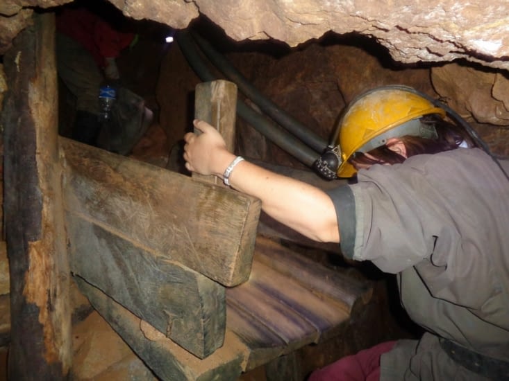 Nos lampes sont désormais allumées, on nous guide jusqu’à l’entrée de la mine. C’est une trou cylindrique, creusé à l’horizontal dans la roche, renforcé par des poutres de bois. Bien sur , 2 rails s’engouffrent dans la pénombre au centre de la gorge.