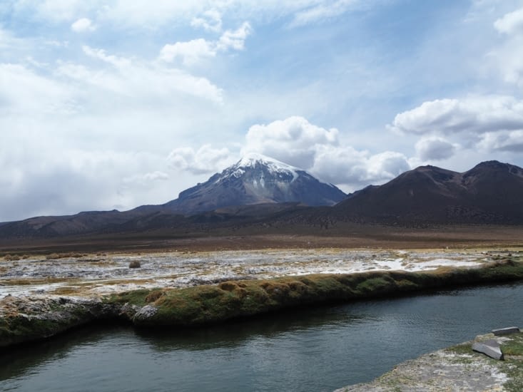 Après 3heures de marche à travers désert, terre, mais aussi marécages, nous entrons dans la zone des sources thermales. Une cholitas y lave ses linges. Les paysages sont somptueux. Des bacs naturels d’eaux chaudes et limpides embrument la zone. Nous nous empressons de régler les petits droits d’entrées (30 Bs par personne) que doivent payer les touristes (mais pas les locaux) pour avoir l’autorisation de se tremper dans les eaux littéralement sulfureuses, au pied du mont Sajama.