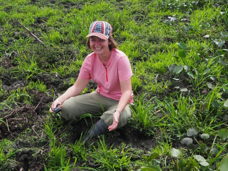Nous arrivons rapidement à la zone marécageuse recherchée. Tout autour d’un lac se trouve une sorte de rive de boue d’une vingtaine de mètre de large, assaisonnée d’herbes. La boue est relativement profonde : les bottes ont tout juste la bonne hauteur. L’odeur est très forte, presque désagréable. L’eau doit stagner ici et ça sent franchement les égouts.