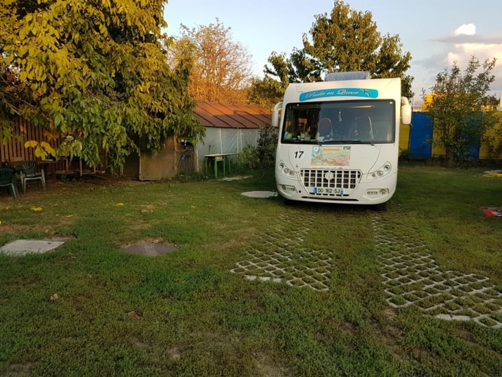Le repas de 13h00 avalé sur une aire d'autoroute et nous arrivons à notre point de chute qui nous convient très bien. Il est chez un particulier avec tous les services necessaire: eau froide et chaude, vidange eau noire et grise, douche ...et il est fermé à clef! Que demander de mieux, qui plus est...a 3mn du métro et à 12mn du centre de Sofia.