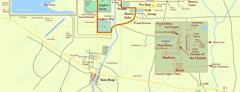 Angkor Thom est une cité fortifiée, c'est la dernière grande capitale de l'Empire Khmer. Elle pouvait accueillir 1 million de personnes! Elle est composée plusieurs édifices. Bayon, un temple composé de 54 tours gothique decorée de 216 têtes géantes d'Avalokiteshvara qui sourient et de 1,2 km de bas reliefs ; de Baphuon qui lui, a été complètement démonté pour être remonté ensuite pour sa restauration.