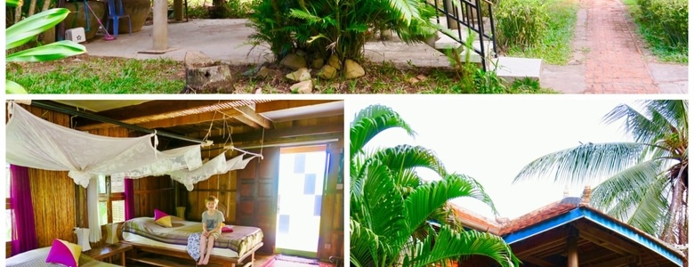 Les propriétaires, un couple franco-cambodgien, sont adorables. Ce lieu paradisiaque a aussi d’autres attraits : une grande salle en bois ouverte sur le jardin où sont servis des repas délicieux, et qui abrite aussi livres en français (des Picsou magazine !!), jeux de société, babyfoot, ping pong, fléchettes, tir à l’arc... Un vrai bonheur pour Maël qui passe des heures à lire, à jouer... dans un cadre magique !