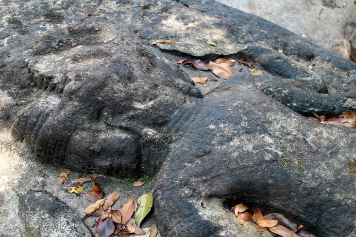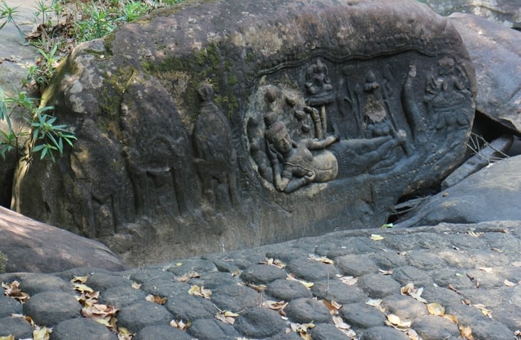 Je vais aller revoir aujourd’hui Kbal Spean, la rivière aux 1000 lingams, dont le lit est superbement sculpté. Elle est située à une cinquantaine de km de Siem Reap. Pour atteindre le site, il faut grimper environ 2 km sur un sentier assez facile, mais il fait bien chaud ! En cette saison, il n’y a presque plus d’eau dans la rivière, ce qui enlève un peu de charme au site, mais a l’avantage de mettre en évidence quelques sculptures que je n’avais pas remarquées auparavant.