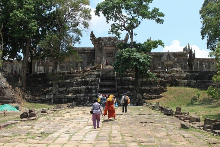 Dernière journée à Angkor, que je vais mettre à profit pour visiter un des temples les plus éloignés : le Preah Vihear qui me fait rêver depuis bien des années. C’est un temple construit au XIe siècle, dédié à l’origine à Shiva, maintenant lieu de pèlerinage bouddhiste.Depuis 1953, il est source d’un conflit frontalier entre le Cambodge et la Thaïlande qui aimerait bien se l’approprier, surtout depuis qu’il a été classé au patrimoine mondial de l’UNESCO. Des échanges de tirs ont eu lieu il y a quelques années, depuis, la frontière est fermée entre les deux pays au nord du temple.Le temple est construit sur une montagne qui domine de 500 m la plaine cambodgienne. Très peu de touristes le visitent car il y a environ 3 H 30 de route depuis Siem Reap. Je suis très enthousiaste à l’idée de le découvrir enfin. Nous y allons en voiture avec Roth qui a une fois de plus emprunté la voiture de son beau-père. Nous partons à 7H30 sur une route assez bonne. Nous arrivons au pied de la colline vers 11 H. Il va maintenant falloir emprunter un pick-up pour monter jusqu’au temple. Il est interdit de monter par ses propres moyens, la route étant très escarpée.Il y a pas mal de visiteurs, uniquement des cambodgiens, et notamment un grand nombre de jeunes moines. Bien sûr, c’est dimanche et le Preah Vihear est un lieu de pèlerinage très prisé.Le temple tient ses promesses. Il est bien sûr très abîmé, mais l’atmosphère y est prenante.