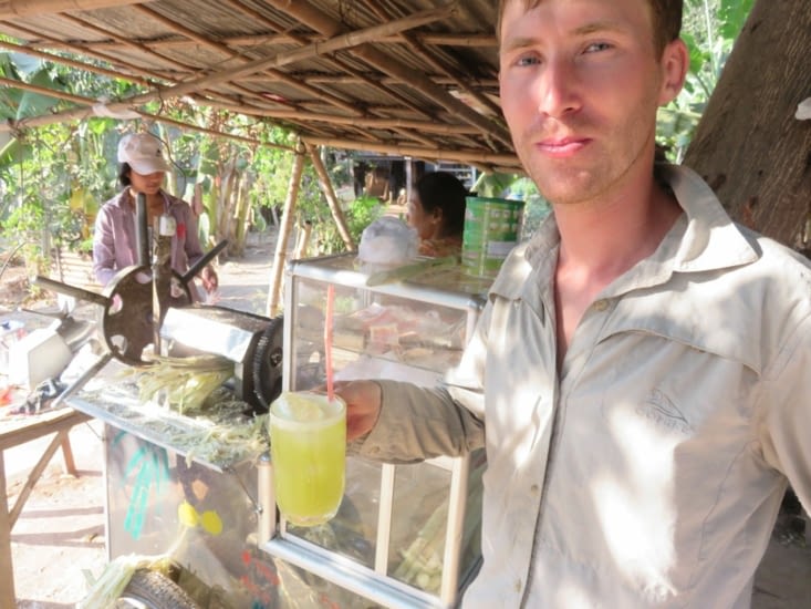 Journée difficile. On sait que de la piste, voire du chemin, nous attend. Et effectivement, ça aura été 30km de 'route', 20km de piste en mauvais état, mais surtout 20km de vtt sableux sous le soleil cuisant. On part sans eau, parce que d'habitude on croise un vendeur tous les kilomètres. Humour du Cambodge, cette fois rien à l'horizon. On finira par trouver un coca et de l'eau, en face de la plus grosse usine de sucre de canne du pays, complément déshydratés.