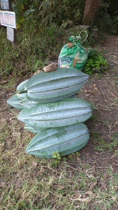Benjamin m'a expliqué qu'il s'agit d'un légume : « Ekongbong fruit ». On dirait une énorme carambole. Il faut laisser ce fruit-légume pourrir, en récupérer les graines et les planter. Elles donnent une plante dont les feuilles sont utilisées pour faire une sorte de ndolé.