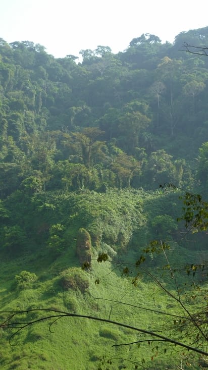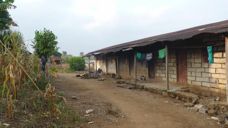Mes pas m'ont menées sur un sentier où un homme m'a dit : «il y a un quartier là », traduisez un village. J'ai donc suivi ses pas à travers la brousse et environ un quart d'heure plus tard j'ai trouvé un village dans la forêt. Je suis allée dire bonjour à la maman, lui ai expliqué que je suis à la Villa Luciole. Elle était en train de préparer, avec les enfants, une petite charrette pour aller vendre les plantains. Je n'ose même pas imaginer comment ils ont poussé cette charrette par le sentier étroit et accidenté que je venais d'emprunter.