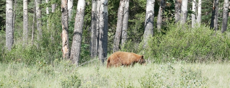 Sur la route du retour au camping de Canyon Johnston, nous apercevons un convoi de véhicules arrêter sur le côté, ce qui laisse présager un animal. Nous nous arrêtons et là un ours ou du moins un grizzli, notre premier. Il s'agit d'un jeune grizzli vu sa taille, une démarche pataude comme ses autres congénères ours noirs. Nous le laissons tranquille pour commencer à faire le feu au camping.