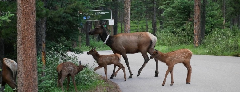 Réveil 5H30 du matin, nous sommes décidés à faire la route jusqu'au Lac Moraine avant de quitter les Rocheuses en se disant qu'à des heures matinales la route ne pourra pas être bloquée. Petite surprise matinale avec un troupeau de Wapitis traversant le camping à l'heure où peu de monde sont encore levés à part nous qui profitons du spectable.