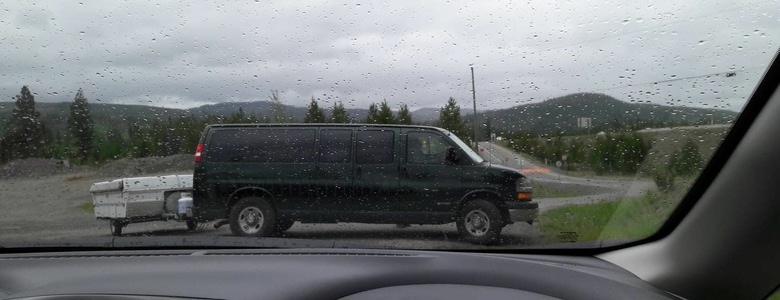 D'ailleurs nous trouvons une sortie sur l'autoroute pour petit-déjeuner et de se poser regarder la forêt qui nous entoure, essayant de percevoir le moindre petits infimes mouvements dans les herbes ou feuillages. Mais les animaux ne sont pas de sortie. Le temps de reprendre la route que nous tombons sur un gros van avec une remorque planté au milieu de la route. Une dame en sort et se dirige vers nous. Il semble qu'elle ne sache pas manoeuvrer avec la remorque et tentant de faire demi-tour, elle s'est retrouvée bloquée au millieu du chemin. La bonne action de la journée fut là. Alex réussit la manoeuvre non sans mal et nous étions de nouveau sur la route.
