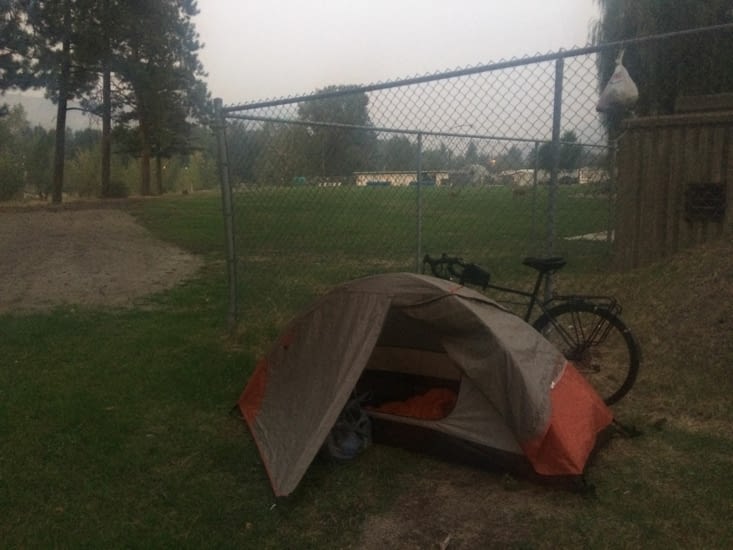 C'est avec deux pneus flambants neufs (mais montés à l'envers, comme me le fera remarquer quelqu'un un peu plus tard dans la journée -_-), et toujours dans une épaisse fumée, que j'attaque mon cinquième jour de route par un bon 20 kilomètres de montée sèche. Ouch, ça fait mal, très mal ! Je passe ensuite le reste de la journée à monter et descendre des côtes, plus ou moins longues (jusque 30 kilomètres de long pour la dernière…). Je me surprends néanmoins à arriver relativement en forme à Grand Forks, au terme d'un peu plus de 6 heures passées sur le vélo. Une bonne journée, où l'omniprésence de cette fumée me donne pour la première fois un léger goût d'amertume. Je n'avais en effet pas eu l'occasion de venir dans la vallée de l'Okanagan durant mes précédentes gesticulations canadiennes, et je me faisais un plaisir de venir y rouler. Malheureusement, je n'ai guère pu en profiter.