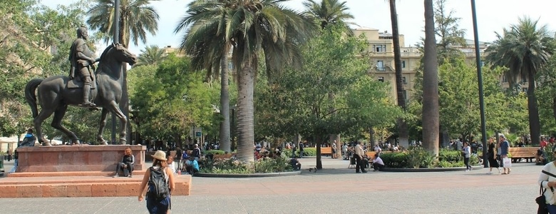 Nous retraversons le Mapocha pour arriver à la place d'Italie, rebaptisée place dignidad, épicentre de l'insurrection Chilienne. Des piquets de grévistes y sont encore présent et les alentours ne sont que vitres cassées et bâtiments peints en tous sens. Plus un feu, plus un trottoir. Le site semble sous le contrôle des jeunes manifestants qui assurent la circulation en échange de quelques pièces. A moins que ça ne soit une sorte de racket savamment organisé… Nous escaladons le cerro Santa Lucia au moment où le ciel se dégage. Un panoramique sur l'ensemble de la ville avec au loin, la cordillère.