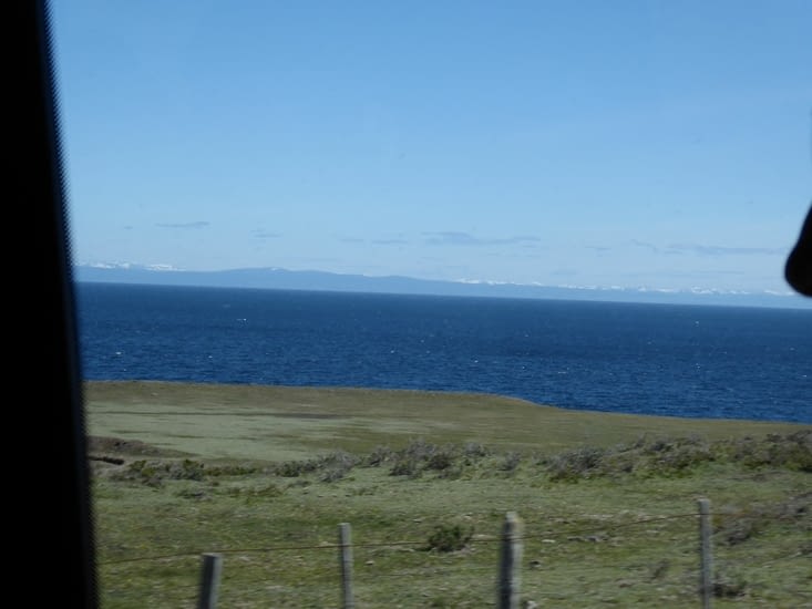 La route longe la Bahia Inutil (la baie inutile) et je ne peux retenir un Waouh d'admiration devant le spectacle du vert de la steppe associé au bleu azur des eaux, au bleu ciel du... ciel et à la blancheur des sommets enneigés de la Cordillère de Darwin. Ce n'est pas très facile à rendre en photo depuis le mauvais côté du bus, roulant à vive allure sur la piste gravillonnée. Je mets l'appareil sur prise de vue à travers la fenêtre et, bien sûr, j'oublierai de rechanger avant de photographier les manchots. Sniff.
