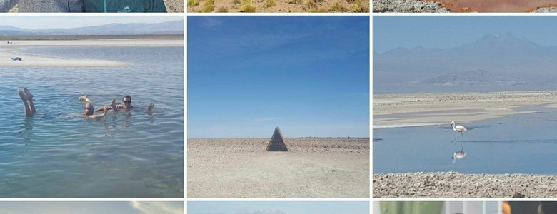 Fin d'aprem, le guide nous emmène près d'un désert de sel avec de belles couleurs. À notre retour au van, le soleil se couche et surprise… le guide nous a préparé un super apéro pour profiter de la vue avant de rentrer. Trop bien ! Son guacamole est fait maison, pâté de jambon et poulet idem et le « pisco sour » coule à flot = 2ème expérience géniale de la journée après le barbotage flottant. Ultra relaxant de trinquer face au soleil couchant, au milieu du désert avec la cordillère des Andes en arrière-plan. Claire & Christelle étaient en crise de fou rire pendant tout le trajet retour : l'effet du pisco sour en altitude…