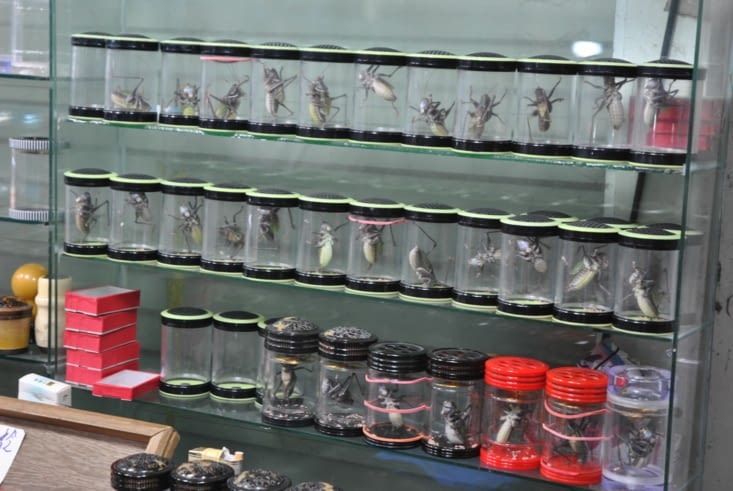 Après ce bon petit repas, direction un autre marche, celui aux criquets ! Autant dire que les filles ne risquent pas d'y faire la sieste. Ici nous y trouvons, apparemment, de grands spécialistes de ces petits insectes qui les inspectent de fond en comble à l'aide de lampes torches... Leur objectif, trouver LE criquet qui leur fera gagner les concours de cris ou de combats !