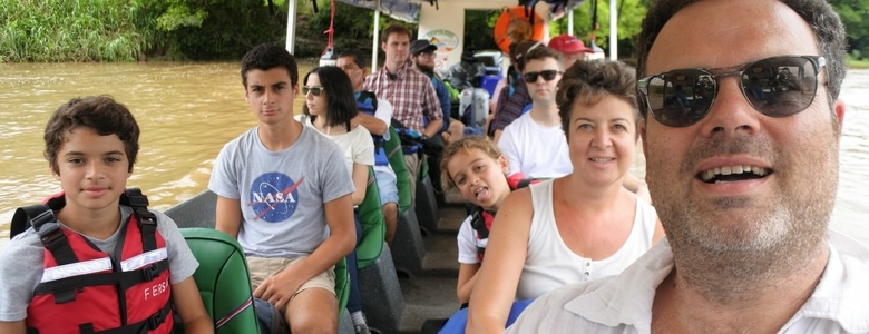 Coté activités, c'est le top. Nous avons une guide francophone qui nous amène dès 5h45 du matin en canoë sur les canaux du parc national de Tortuguero. Nous observons des toucans, des singes hurleurs, des singes capucins, des iguanes, des basiliques Jesus Christ.... et deux alligators, l'un dans l'eau (on voit les yeux) et le second installé tranquillement sur un tronc, tout le corps est visible. Incroyable !