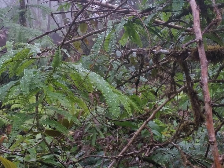 Comme si la foret voulait nous montrer que c'est elle qui décide qui peut y pénétrer, après avoir repris le sentier dans le sens du retour, la pluie s’arrête! Nous regardons la montagne qui s'est cachée dans les nuages bas, le sommet du Ténorio restera un mystère.