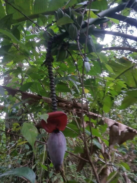 Nous marchons sur un sentier de plus en plus abrupt, nous grimpons sur les flancs du volcan. Autour de nous, dans la foret, nous voyons des plantes et des fleurs de toutes les formes et de toutes les couleurs, une fleur ressemble à un oiseau, une souche complètement morte et pourrie donne naissance à une jeune pousse qui sort du tronc en décomposition.