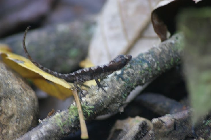 Sur une petite branche au sol, un mimi lézard immobile, de la même couleur que la branche, il nous aura fallu l’œil expert d'un garde forestier qui passait pour le voir. le même grade à qui l'on demande quelle est cette graine qui pousse juste là, nous dira que c'est une graine de la même famille que le poivre, mais que personne ne la mange. Par contre les singes s'en servent comme antiseptique, ils la mâchent pour en faire une pâte, qu'ils déposent ensuite sur leurs blessures pour empêcher qu'elles s'infectent.
