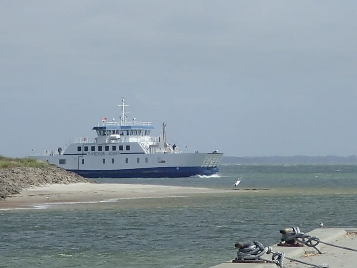 La urbon Thyborøn vi devinas en la malproksimo. Por atingi ĝin, ni veturas inter la maro, kiun ni ne povas vidi, kaŝita malantaŭ la duno kaj lago. Ni aĉetas tie kaj manĝas subĉiele en la parkejo Spar antaŭ ol iri al la haveno, kie ni suriras la boaton, kiu kondukas nin trans la kanalon, kiu kunligas la maron al grandega Fjordo, kie la akvoj estas sufiĉe malkvieta : ĝi estas granda boato, sed oni tamen sentas la ondon.