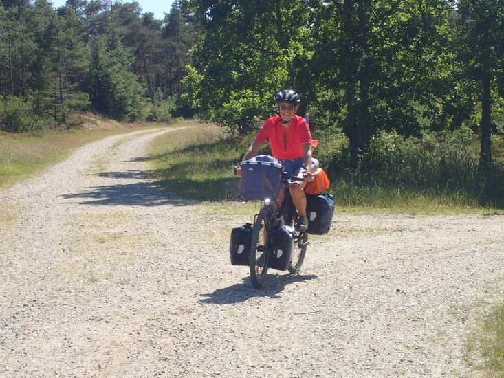 C'est toujours le noroit qui souffle., le vent venu de la mer.C'est ici le vent dominant. Il n'est qu'à voir la forme qu'il imprime aux cimes des arbres échevelés. On a le sentiment qu'il nous pousse à peine, ce n'est qu'au détour de quelque virage qu'on s'aperçoit qu'il n'en n'est rien et qu'il reste gaillard, même s'il est bien plus faible que ces jours derniers.La route du jour semble, comme un adieu à cette magnifique côte ouest que nous allons bientôt quitter pour reprendre au sud, récapituler tous les paysages et tous les types de routes que nous avons vus et pratiquées depuis notre arrivée au Danemark. Routes empierrées ou compactées, routes désertes couvertes de plaques de béton en plus ou moins bon état, petites routes de campagne asphaltées ponctuées de quelques virages, routes plus passagères, équipées ou non de pistes cyclables, voire route nationale (la 181 se rappelle à nous rectiligne à l'infini).Quelques reliefs aussi, plus que nous n'en n'avions jamais eu jusqu'alors mais moins qu'en Ardennes ou en Normandie assurément. Et campagne, dunes, landes et forêts de petits chênes ou de grands résineux. Maisons basses au toit de chaume ou de tuiles vernissées, dans les villages ordonnés ou dans les villes sans réel centre ville, ou encore cachées dans un repli de la dune, ne laissant paraître que le sommet du toit, parfois végétalisé pour être plus discret encore.Eglises peintes en blanc au clocher bien différent de ceux que l'on voit chez nous, entourées d'un cimetière à l'air de jardin fleuri, tondu, entretenu avec soin où les vivants viennent s'assoir sur un banc pour discuter avec les disparus ou peut-être pour profiter tout simplement du cadre paisible.Seule la mer, apaisée aujourd'hui, se fait discrète et ne se montrera à nous que deux fois pendant quelques secondes à peine au cours de la journée.Nous arrivons à Hune par la forêt et la ville nous reste cachée jusque dans les derniers mètres. C'est dimanche. De nombreuses familles pique-niquent sur les tables installées en forêt et les enfants profitent des nombreux jeux qui y sont installés. Sauf rare exception, tous les espaces naturels sont ici accessibles à tous. D'une façon générale, quelque soit le lieu, quelque soit le temps, les gens d'ici en profitent. Il savent, semble-t-il mieux que nous, habiter sans abimer. Jour de pause ce lundi installés dans le magnifique jardin de la maison où nous avons loué une chambre. Jour de lessive. Jour de travail : il faut finaliser la réservation des hébergements des prochains jours et corriger le cas échéant les traces GP. jour de repos.aussi.