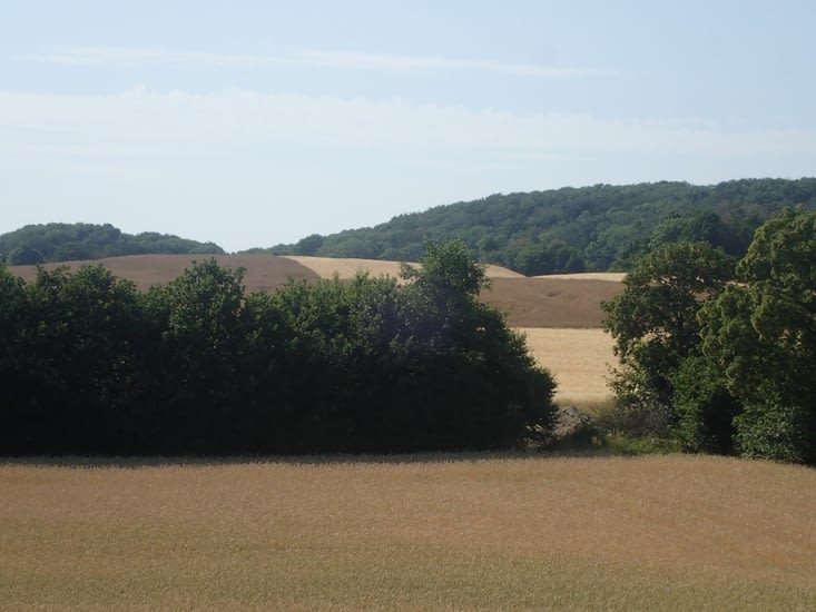 Le soleil est déjà chaud mais ce sera pire dans l'après-midi, nous aurons jusqu'à 32°, à l'ombre. Mais nous nous sommes le plus souvent au soleil. La forêt parfois nous abrite mais il y a de longs passages sur des routes au bord des champs, sans ombre. Et puis on pédale, ça réchauffe aussi.L'étape est par ailleurs loin d'être plate. Les longues montées dont la pente sans être excessive exige cependant un effort soutenu sont suivies de descentes qui, allez savoir pourquoi, ne semblent pas la juste récompense de l'effort produit. Nous roulons en fin de journée dans le Parc National de Mols Bjerge. Bjerge, ça veut dire montagnes... ça doit être pour ça !Il y a un peu de vent. Ce coquin a tourné, il vient aujourd'hui du sud-est, face à nous. Quelle belle fidélité ! C'est un avantage : il nous rafraichit un peu ; c'est un inconvénient, faut pousser. Le cocktail chaleur, pente, vent est fatigant et nous ne sommes pas mécontents d'arriver à l'étape.Le camping a deux zones. L'une, chère, est face à la mer, quasiment les pieds dans l'eau, face à l'île de Hejlm qu'on aperçoit au large. L'autre, moins chère, est située à l'arrière. Comme toujours, les besoins des randonneurs ne sont pas la préoccupation des gérants du site. Pas de fil pour étendre le linge, pas de table, juste un banc près de l'aire de jeux. A l'ombre à cette heure-ci, par chance car, si ce n'était pas le cas, il resterait à cuire au soleil.Les douches sont en supplément (2 couronnes la minute), la cuisine a bien des plaques de cuisson gaz mais pas de casseroles et l'utilisation du four est, bien sûr en supplément, de même que l'Internet, facturé 5 €, 1 € de plus que la boule de glace. Nous sommes au Danemark, tout est cher. Dans une zone touristique, c'est encore plus cher.Comme il n'y en n'a pas dans la cuisine et qu'il fait plus de 30°, l'employé de l'accueil, sympa, accepte cependant de mettre nos quelques victuailles au frigo – dont notre bouteille de Grimbergen – et de réfrigérer nos petits pains de glace. Ce dernier service est normalement facturé 2 €.L'itinéraire du jour a été aussi magnifique que celui de la veille auquel il est assez semblable. Alternance de forêts et de magnifiques champs de céréales qui s'étendent si loin qu'il construisent à eux seuls l'horizon, tout en nuance de mordoré. Une merveille. Et puis, ici où là, la mer, quand on ne l'attend plus, vient vous surprendre au détour d'un virage où au bas d'une descente, dans sa majestueuse beauté. On a préparé et tracé l'itinéraire, on devrait s'y attendre. Mais c'est toujours un surgissement. Aucun point du pays n'est paraît-il situé à une distance de plus de 52 kilomètres de la Grande Bleue, ça aide. La cuisine au moins témoigne de cette proximité entre le Danois et la mer. On vous confirme à ce propos que les boulettes de poissons, que le maquereau et le saumon fumés achetés au marché sont les meilleurs que nous ayons jamais mangés.