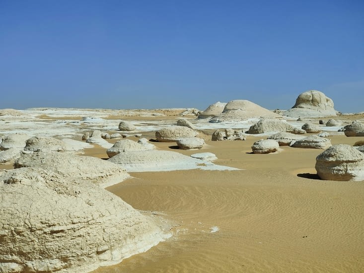 Le « Désert Blanc », c’est ainsi que l’on appelle cette partie méconnue du Sahara, à l’ouest du Nil, en Egypte. Son nom, il le doit à la craie qui le recouvre tout entier. L’érosion de la pierre tendre est à l’origine de ces étendues de sable immaculé, d’où surgissent des sculptures fantomatiques façonnées par le vent…