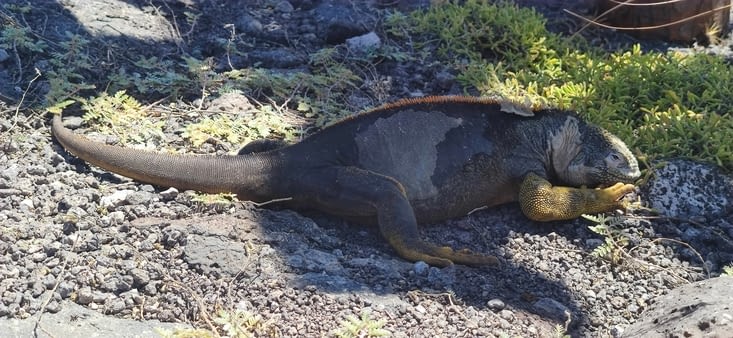 Les îles Plaza sont 2 bouts de terre de quelques centaines de mètres de long, très plats, mais qui abritent un écosystèmes complet d'Iguanes de terre, d'oiseaux endémiques et de lions de mer. Beaucouo de cactus géants et une sorte de lichen qui tapisse le sol de l'ile. Rochers de lave partout bien sûr. A certains endroits, les rochers de lave sont blancs : les lions de mer qui ont habité l'ile pendant des siècles ont tellement frotté leur peau en passant sur les rochers de lave que ça les a polis et rendu blancs presque brillants. Malheureusement, le phénomène El Nino a eu raison de cette immense colonie dans les années 85-90 et elle a quasiment disparue. Il n'en reste que quelques uns. Effet direct du réchauffement climatique.