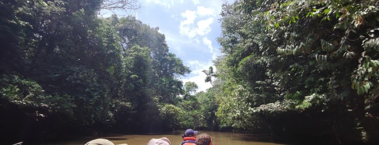 Nous sommes attendus et embarquons bientôt sur une pirogue de 15 personnes vers Nicky lodge. Nous naviguons sur le fleuve entre les arbres et recherchons les oiseaux et la faune observables : toucans, pics verts, poules d'eau, loutres de mer, dauphins d'eau douce, Anaconda. Nous apercevons plusieurs espèces, plutôt furtivement. Nous arrivons 2h30 plus tard à notre lodge, après une averse très forte qui nous trempe tous malgré les ponchos de pluie qui nous sont prêtés !