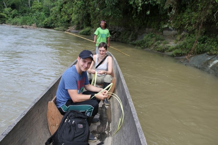 Le programme de la journée, la pêche ! On embarque sur la pirogue et en avant. Nous sommes cinq. Luis, Raoul le père de la famille qui nous accueille, le fils aîné Raoul (aussi) et nous deux. Les locaux s'occupent de la navigation, chacun muni d'une grande tige en roseau. Luis nous explique que le courant n'est pas très fort ici, pas besoin de moteur, les bâtons suffisent.