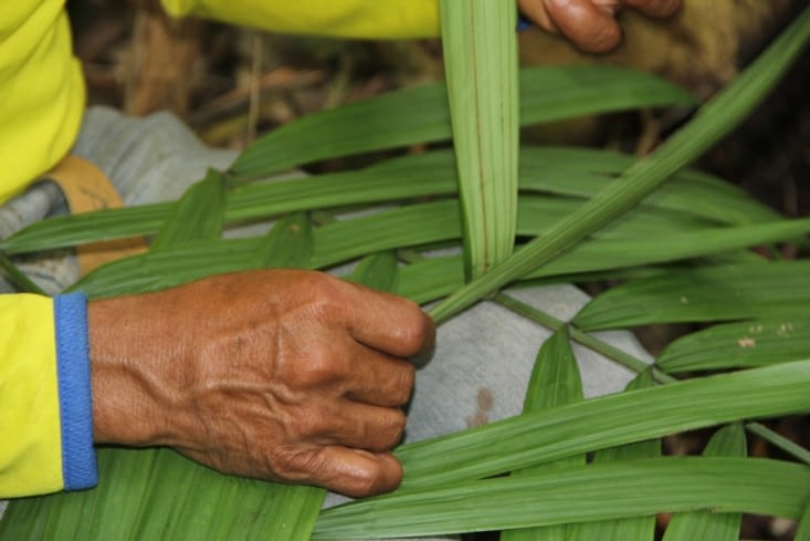 Pendant la descente, Luis nous montre les méthodes de tressage. Dans notre cas, on a fabriqué 2 couronnes pas très utiles, mais ce sont les mêmes techniques utilisées pour faire les toits des cabanes par exemple (voir une des photos précédente).