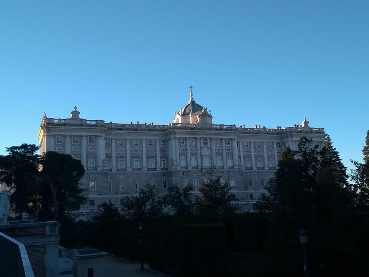 Nos pas nous conduisent ensuite vers le Palais Royal, dont les tons gris sont un peu ternes comparés aux beaux immeubles que nous venons de quitter. Devant la cathédrale, une longue file d'attente s'est formée pour entrer voir la crèche dès qu'il sera 10 h. Nous continuons notre exploration de la ville, en passant notamment par la Place d'Espagne, ou Don Quichotte et Sancho Pança nous saluent.