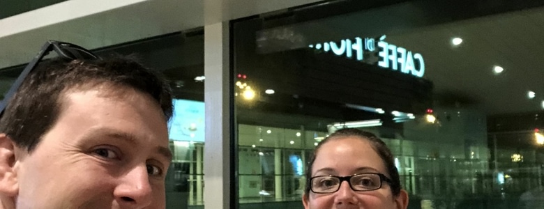Nous nous réveillons, après une courte nuit (4 heures), et prenons la navette pour l'aéroport avec nos 2 sacs à dos de 30L pour 5 semaines (important de le souligner :) ). Après le premier enregistrement, d'un long périple, nos estomacs réclament un petit déjeuner.