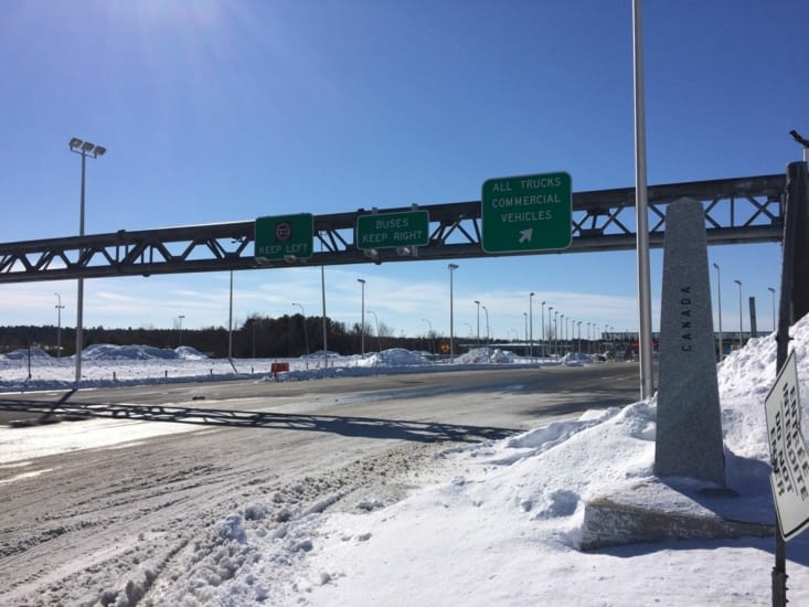 Vient alors le moment délicat du passage de la frontière. Premier constat : il y a plusieurs files pour les voitures, une voie pour les bus, une autre pour les camions et véhicules commerciaux, une ligne pour je ne sais qui, mais aucune signalétique pour les piétons à l'horizon. Du coup, j'ai pris la ligne je-ne-sais-qui. Je me suis mis derrière une voiture, et j'ai attendu que le douanier me fasse signe de m'avancer vers lui. Après plusieurs questions assez sèches, il m'oriente vers le bâtiment de vérification des passeports (passage obligé pour tout le monde) où un autre agent, bien plus sympathique, me fait passer un second interrogatoire, dans une pièce à l'écart (ça c'était que pour moi !). Au final, tout s'est très bien passé, j'ai même dû rappeler à l'agent que j'étais censé payer quelque chose (il m'avait dit que tout était OK sans même tamponner mon passeport...). Un stop plus tard, me voilà à Plattsburgh, avant midi.
